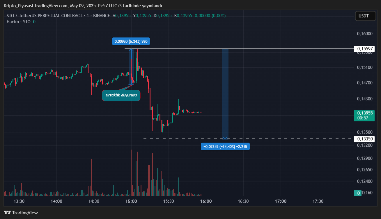 Sıçramanın hemen ardından STO’daki satış baskısının yoğunlaştığı görüldü. Bir anda tüm yükselişini kaybeden STO, -%14’lük bir düşüş yaşadı. Bu düşüşün sebebinin büyük yatırımcıların kar satışları olduğu tahmin ediliyor.
