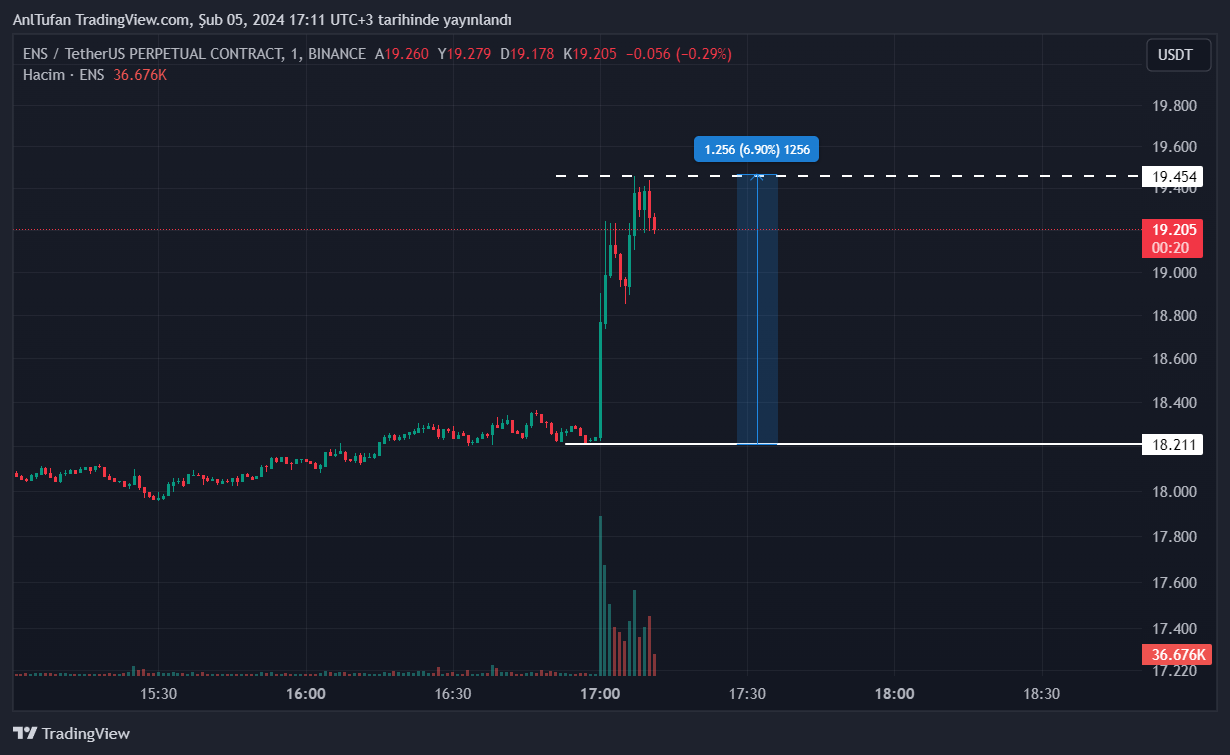 Bu gelen haber ile birlikte Binance’de listelenmiş bir altcoin olan ENS, çok kısa bir süre içerisinde %7’lik bir yükseliş gerçekleştirdi.