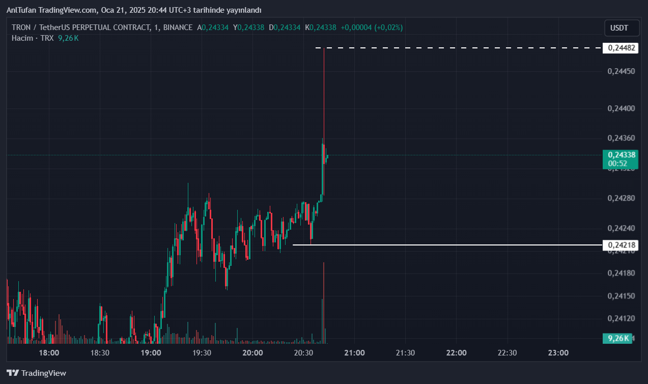 Wintermute ile Tron arasındaki son gelişmeler ışığında TRX fiyatının hareketlendiği gözlemlendi. Kısa bir süre içerisinde 0.244 dolar seviyelerine iğne atan TRX, yine de beklenen yükselişi gerçekleştiremedi.