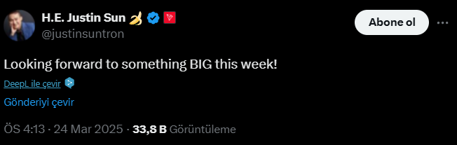 Genel olarak yaptığı spekülatif paylaşımlar ile kripto para sektörünün gündemine gelen Justin Sun, yine harekete geçti. Popüler altcoin Tron‘un kurucusu olan Justin Sun, kısa bir süre önce X hesabından yaptığı paylaşımda, “bu hafta büyük bir şey bekliyorum” dedi.