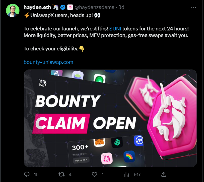 “Lansmanımızı kutlamak için önümüzdeki 24 saat boyunca UNI tokenları hediye ediyoruz. Daha fazla likidite, daha iyi fiyatlar, MEV koruması ve işlem ücreti olmadan takas sizleri bekliyor.”