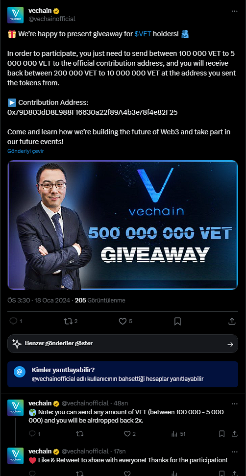 Tipik bir dolandırıcılık tekniği olan “1 gönder anında 2 katını geri alacaksın” sistemini benimseyen bilgisayar korsanları, bu hamle ile yatırımcılardan 2x vaadi ile VET toplamaya çalışıyor.
