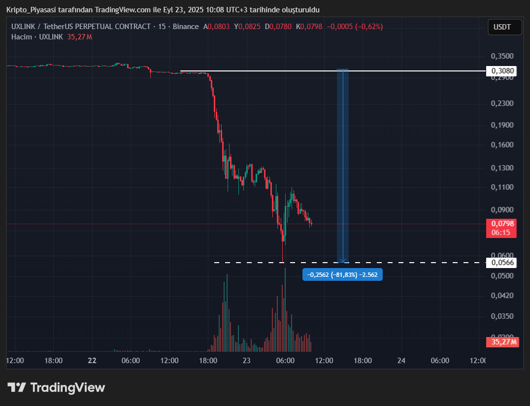 Kısa süre önce ise Binance borsasında listelenmiş bir altcoin olan UXLINK hacklendi ve -%80’lik bir çöküş yaşandı. Halen toparlanmayı başaramayan UXLINK, dip bölgelerde işlem görüyor.