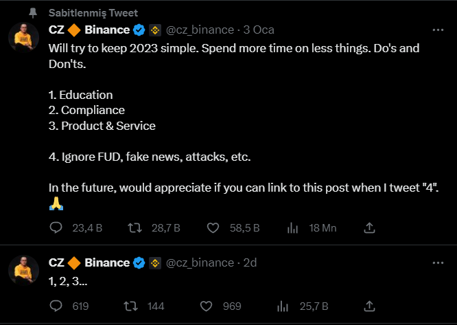 Son dakikalarda resmi Twitter hesabı üzerinden alışılagelmiş olan 4 tweet’inin yerine “1,2 ve 3” rakamlarını tweet olarak paylaşan CZ, kripto para yatırımcılarının dikkatini üzerine çekti.