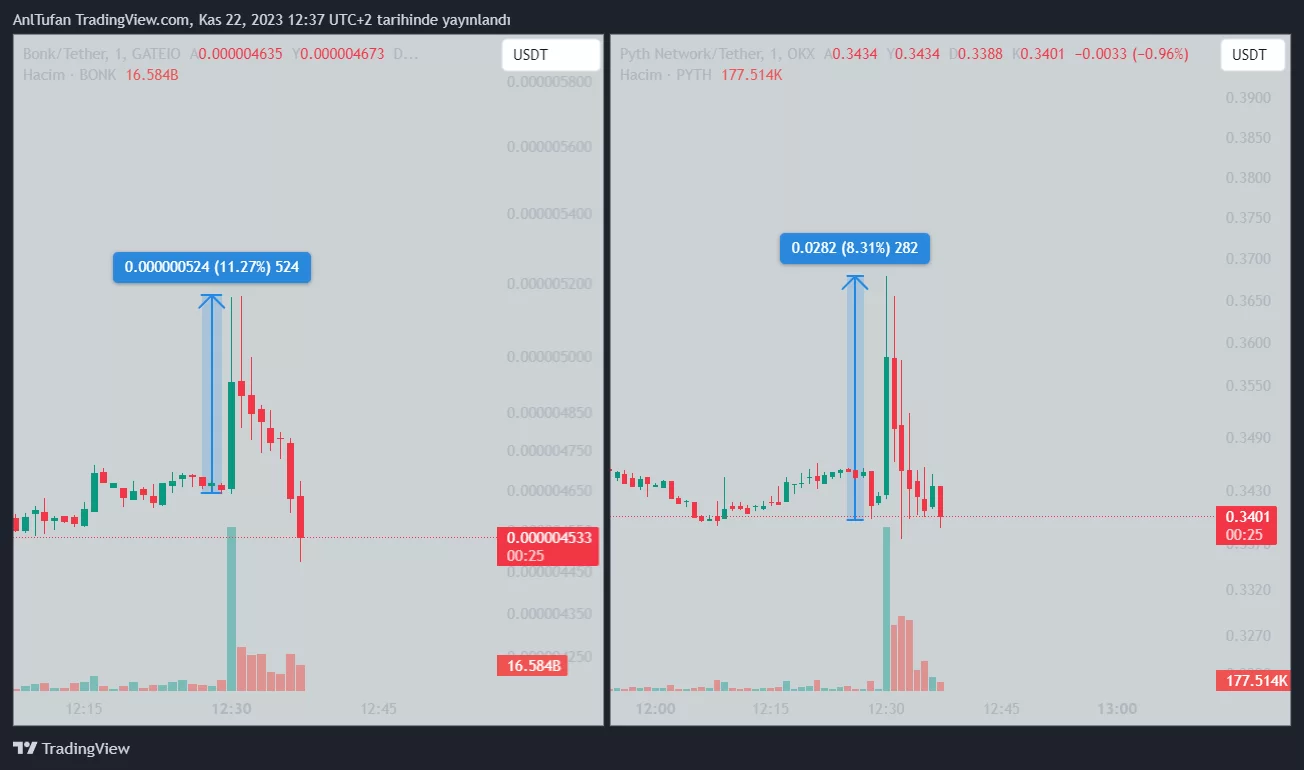 BONK ve PYTH listeleme duyurusu sonrasında ani bir sıçrama gerçekleştirmiş olsa da, ilerleyen dakikalarda volatil bir şekilde düşüş yaşadı ve yükselişlerin tamamını kaybetti.