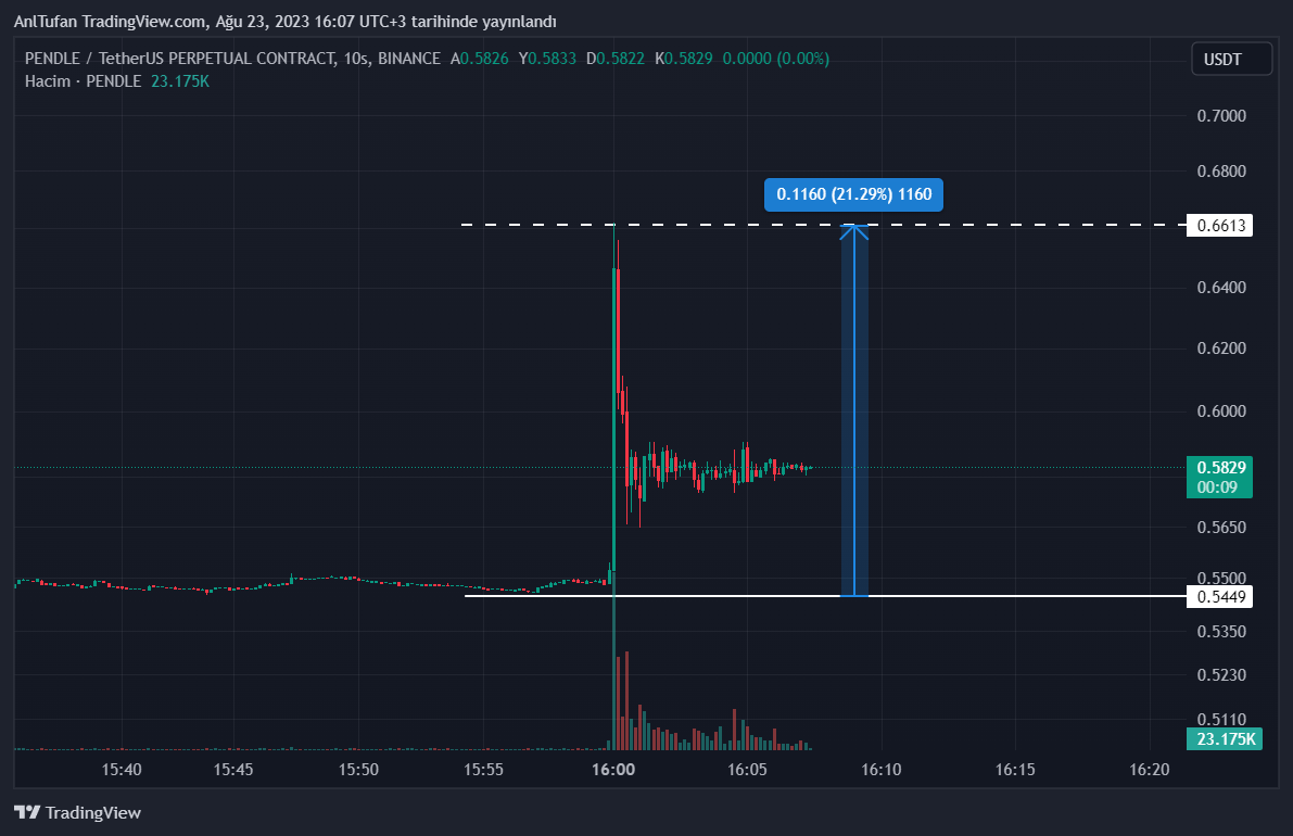 PENDLE, Binance Labs’ın bu yatırımı sonrasında yüzde 20’lik bir sıçrama yapsa da, ilerleyen dakikalarda yükselişlerin bir kısmını kaybetti.