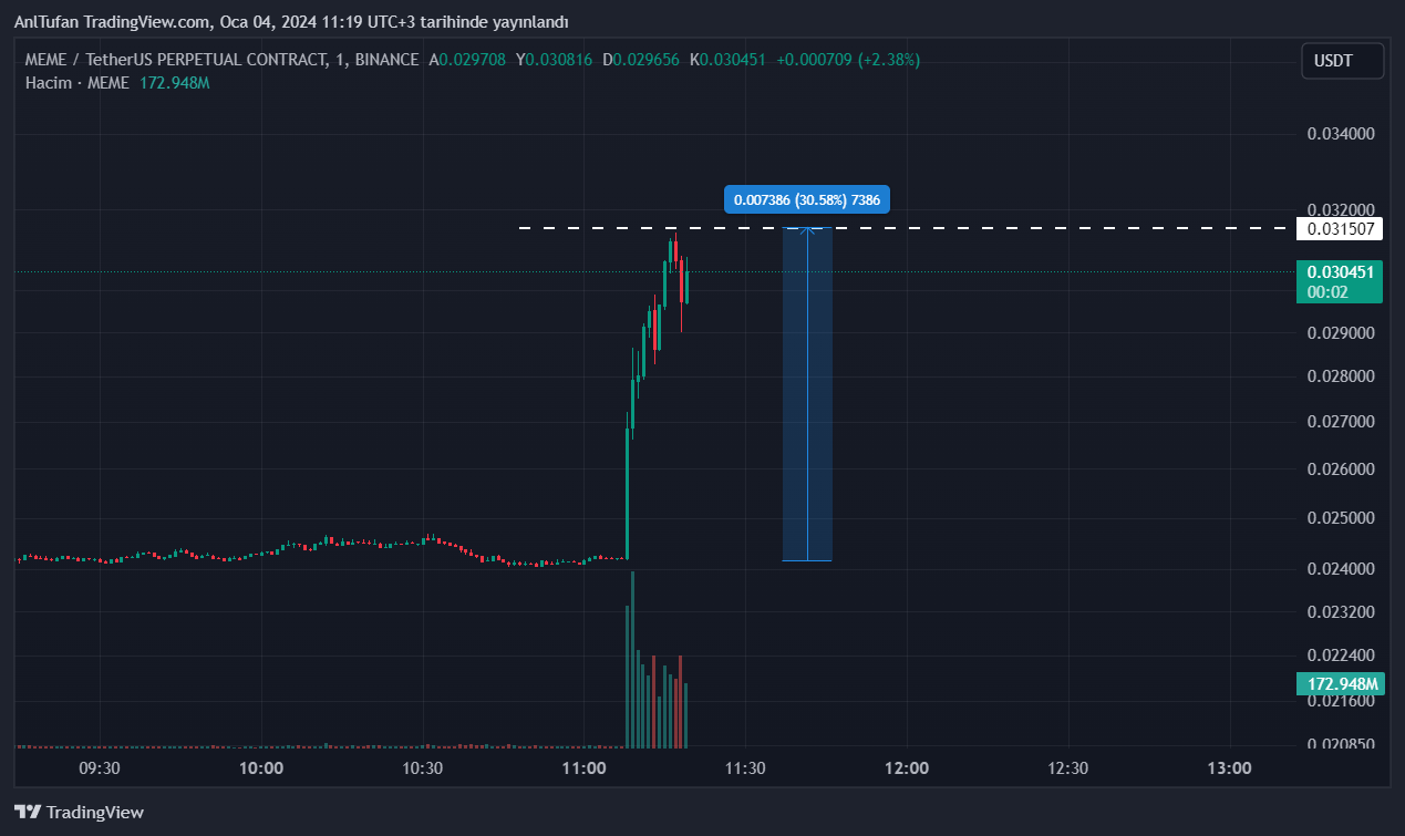 Bu gelen haber ile birlikte MEME isimli altcoin‘in ani yükselişler yaşadığı görüldü. Çok kısa bir süre içerisinde %30’luk bir yükseliş gerçekleştiren MEME, dikkatleri üzerine çekti.