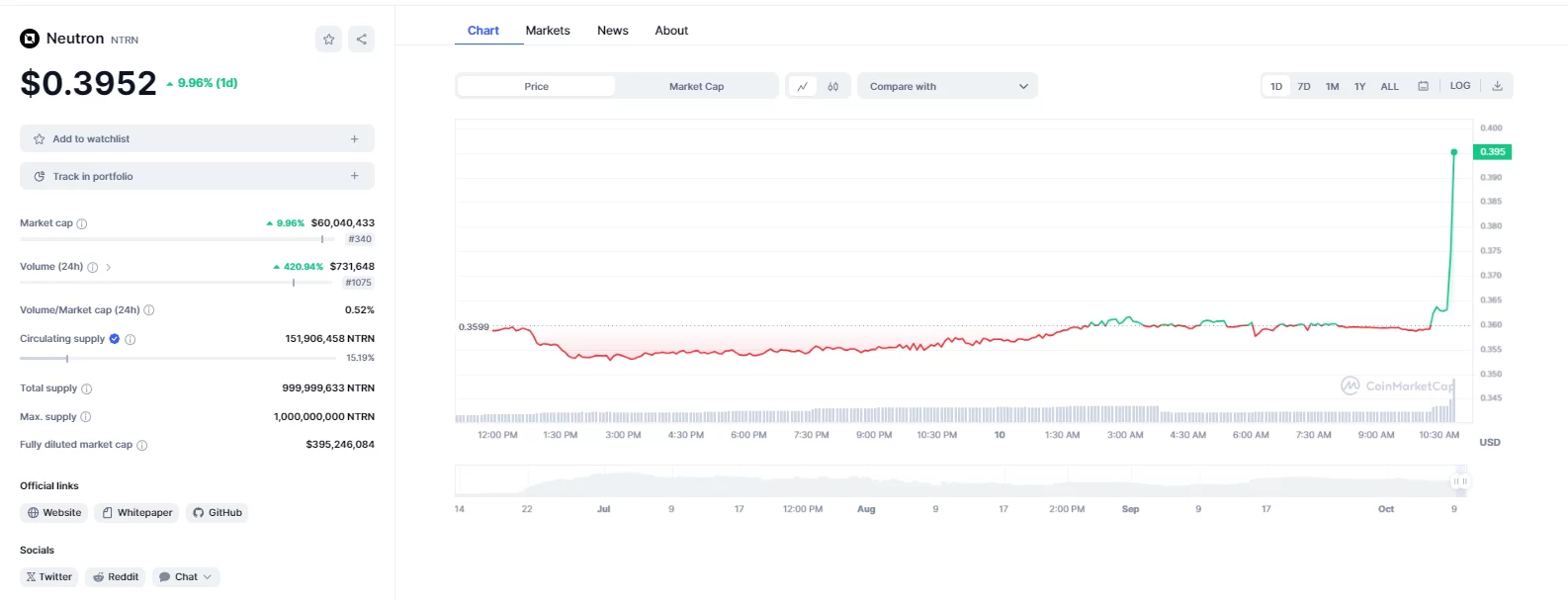 Neutron (NTRN) isimli altcoin şuan itibariyle 0.39 dolar seviyelerinde konumlansa da, herhangi bir popüler kripto borsasında işlem görmüyor. 20 Haziran’da piyasaya sürülen NTRN, asıl çıkışını Binance ile yapacak gibi gözükmekte.