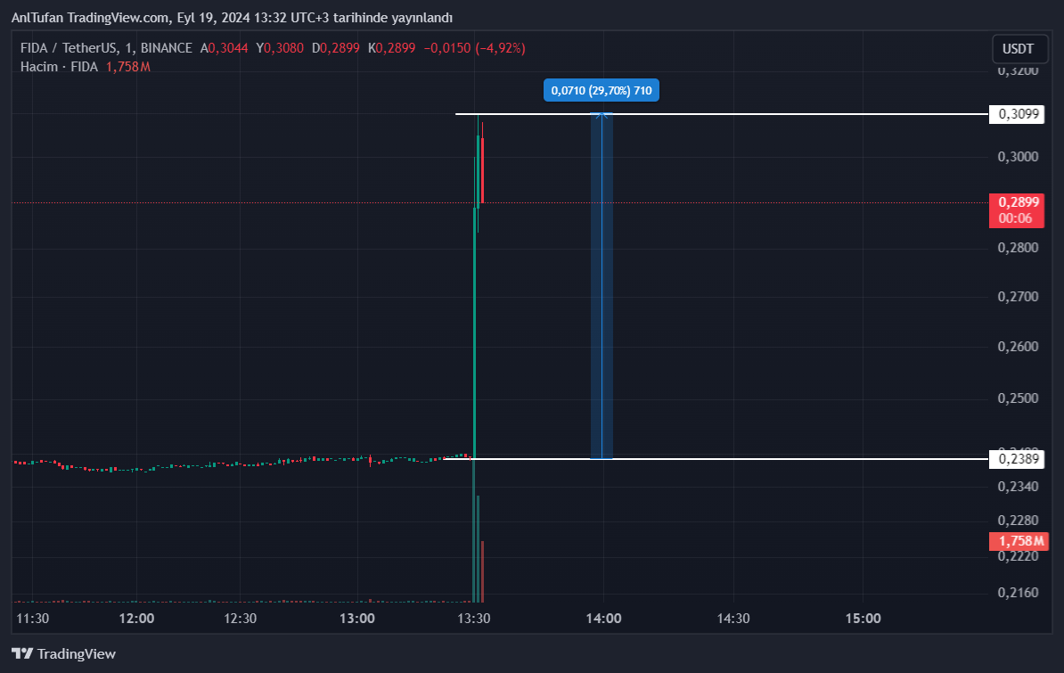 Son dakikalarda gelen listeleme duyurusu ile birlikte FIDA fiyatında %30’a yakın bir sıçrama meydana geldi. Duyuru öncesinde 0.238 dolardan işlem gören FIDA, listeleme sonrasında 0.309 dolar seviyelerini gördü.