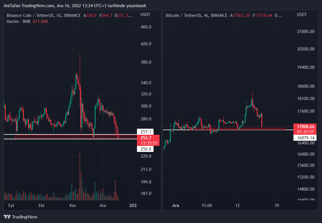 Bu yaşanan olayların ardından Bitcoin 16.800-17 bin dolar aralığına gerilerken, Binance coin (BNB) ise 250-257 dolar destek bölgesine kadar düşüş yaşamış durumda.