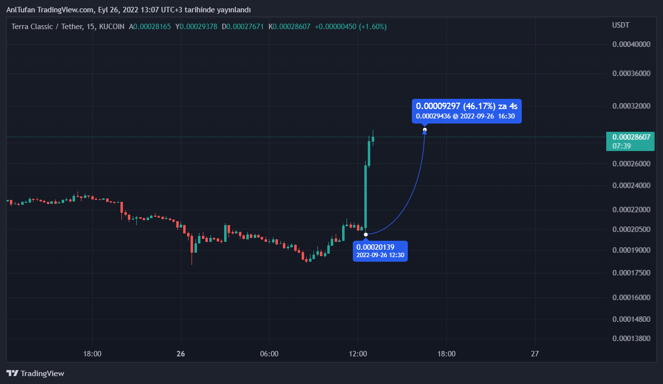 Binance’in paylaştığı duyuru sonrasında gözler Terra Classic’e çevrildi. Dakikalar içerisinde devasa bir yükseliş yaşayan LUNC, tekrardan sektörün gündeminde yer aldığı görülüyor.