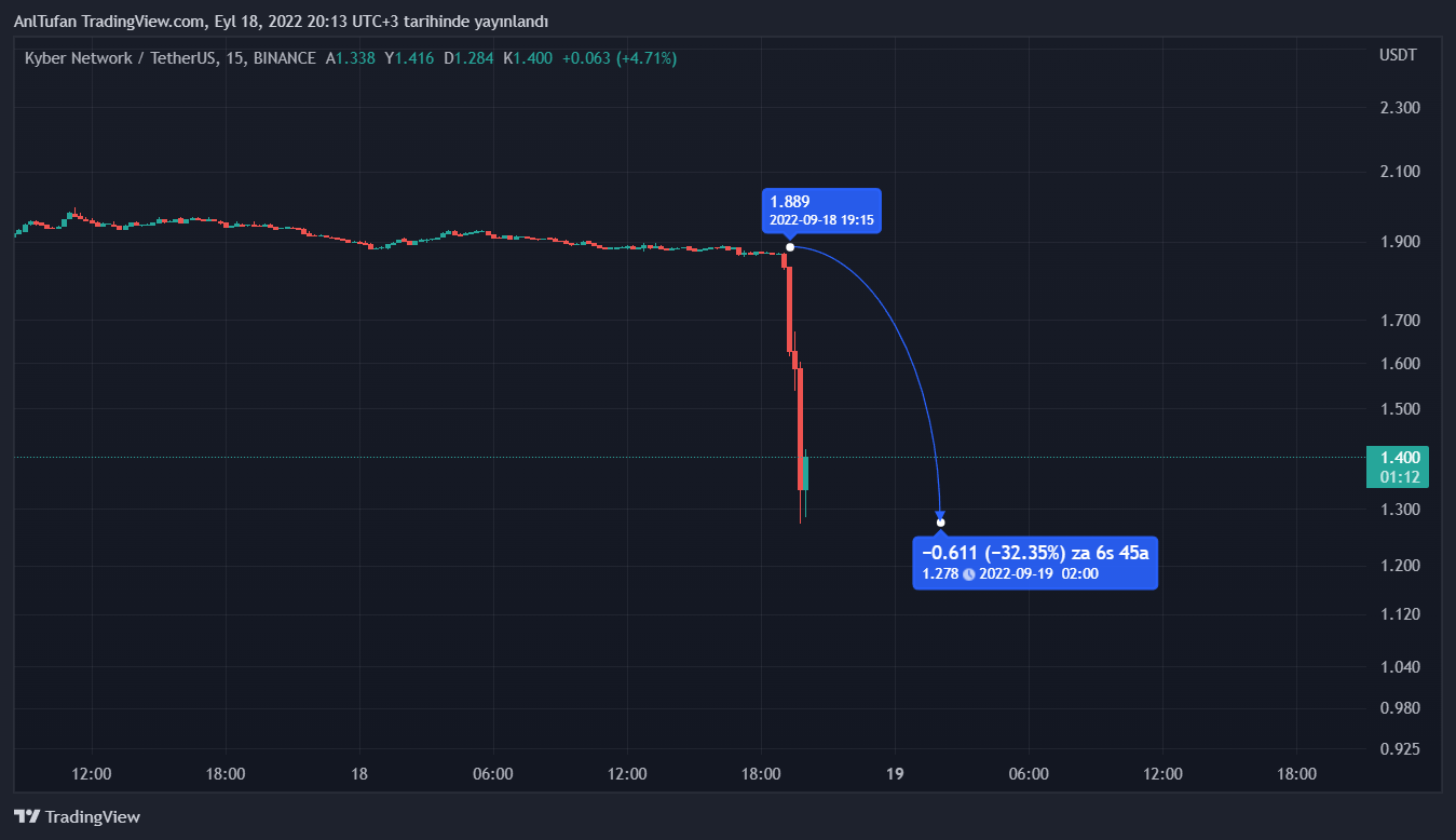 Son 1 saat içerisinde yüzde 30’dan fazla düşüş yaşayan Kyber Network Crystal v2, birçok kripto para yatırımcısının korkuya kapılmasına neden oldu.