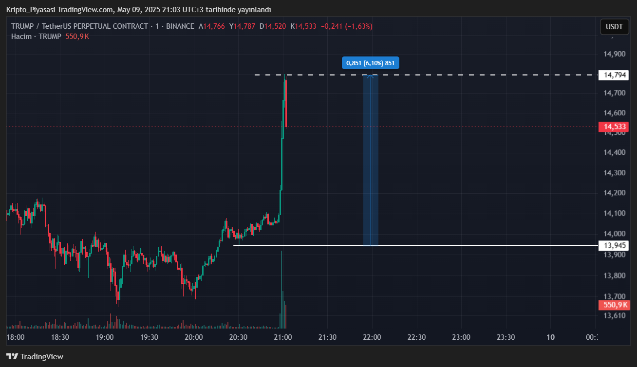 Son dakikalarda ABD Başkanı Donald Trump‘ın memecoin‘i olan TRUMP, yukarı yönlü hareketler sergilemeye başladı. TRUMP coin’in X hesabından yapılan paylaşıma göre 22 Mayıs’ta Donald Trump’ın düzenleyeceği yemekte TRUMP coin’in bir sonraki dönemi duyurulacak.