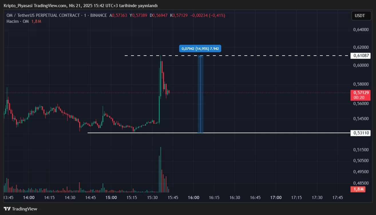 Son günlerin en volatil altcoin’lerinden olan OM, bu son gelişme neticesinde yükselişe geçti. Bir anda %15’lik bir sıçrama yapan OM, dikkatleri üzerine çekti.