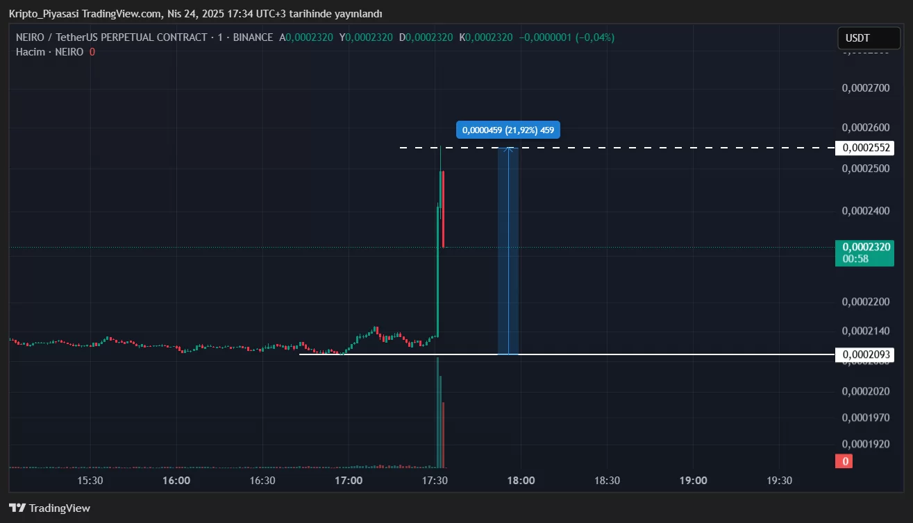 Bu son gelişme ile birlikte Binance’de listeli popüler memecoin NEIRO, ani artışlar yaşadı. Dakikalar içerisinde %22 oranında değer kazanan NEIRO, dikkatleri üzerine çekti.