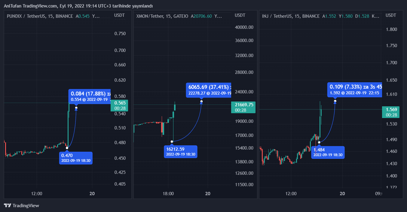 Yarın itibariyle TSİ 19.00’da bu 3 altcoin’i listeleyecek olan Coinbase, INJ, PUNDIX ve XMON’un yükseliş yaşamasını sağladı.