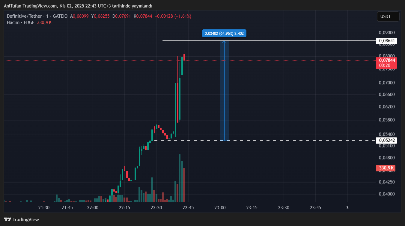 Bu son gelen listeleme duyurusu ile birlikte Definitive (EDGE) fiyatında ani yükselişler yaşandı. Son dakikalarda %60 oranında değer kazanan EDGE, dikkatleri üzerine çekti.