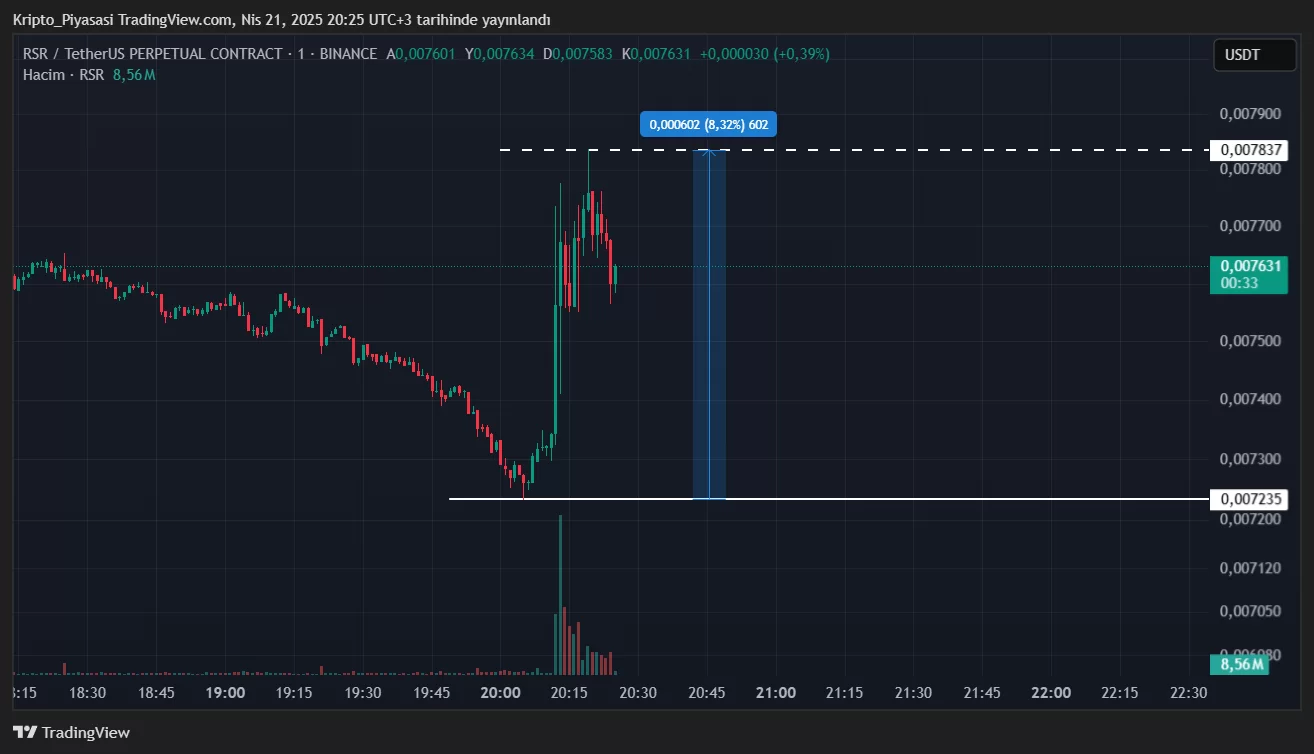 Binance‘de de listelenmiş bir altcoin olan Reserve Rights (RSR), bu son listeleme duyurusuyla birlikte %10’a yakın bir sıçrama yaptı. RSR haberimizin yazıldığı esnada ise 0.00766 dolardan işlem görüyor.