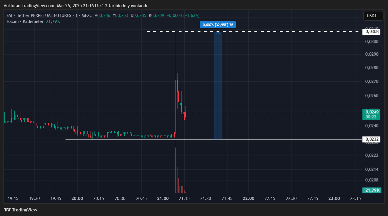 Coinbase’in listeleme gelişmesi ile artış yaşayan FAI, kısa süre içerisinde %30 oranında değer kazanmayı başardı. FAI’nin dakikaların ilerlemesiyle birlikte bu yükselişin bir kısmını kaybettiği görüldü.