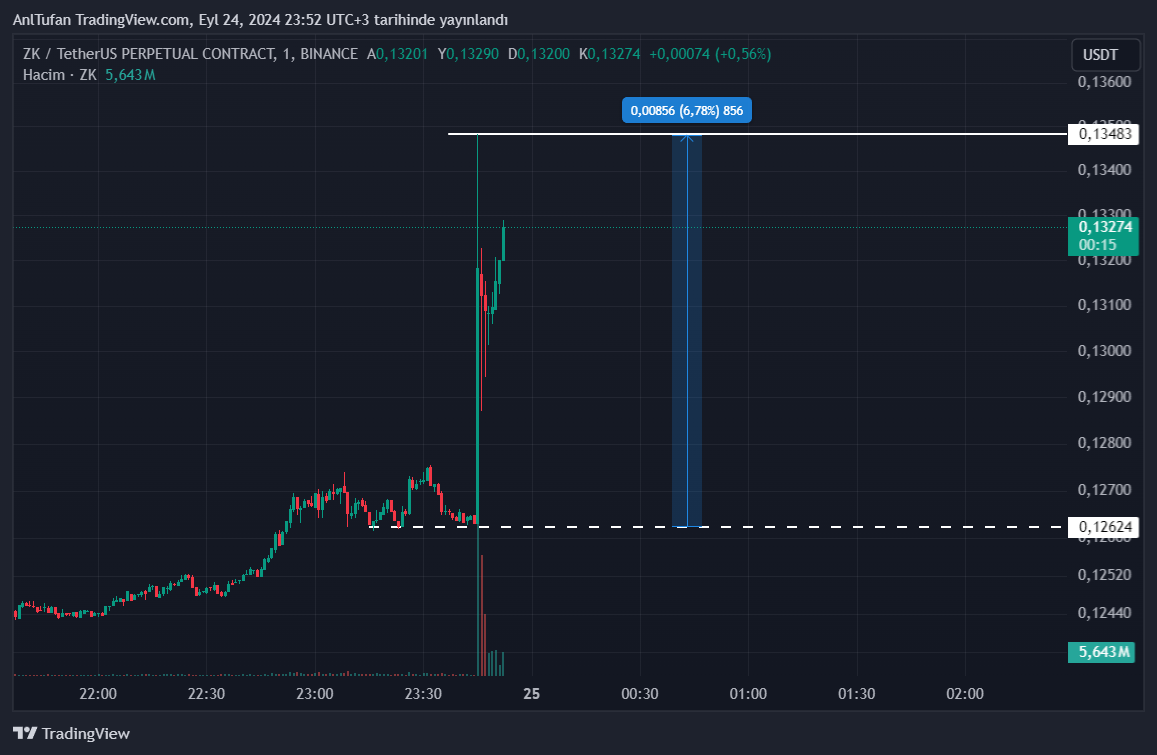 Dakikalar önce paylaşılan bu duyuru ile birlikte ZK %7’ye yakın bir sıçrama gerçekleştirdi. 0.1348 dolarda zirve yapmış gibi gözüken ZK, önümüzdeki dakikalarda bu seviyeyi aşması halinde yükselişlerine devam edebilir.