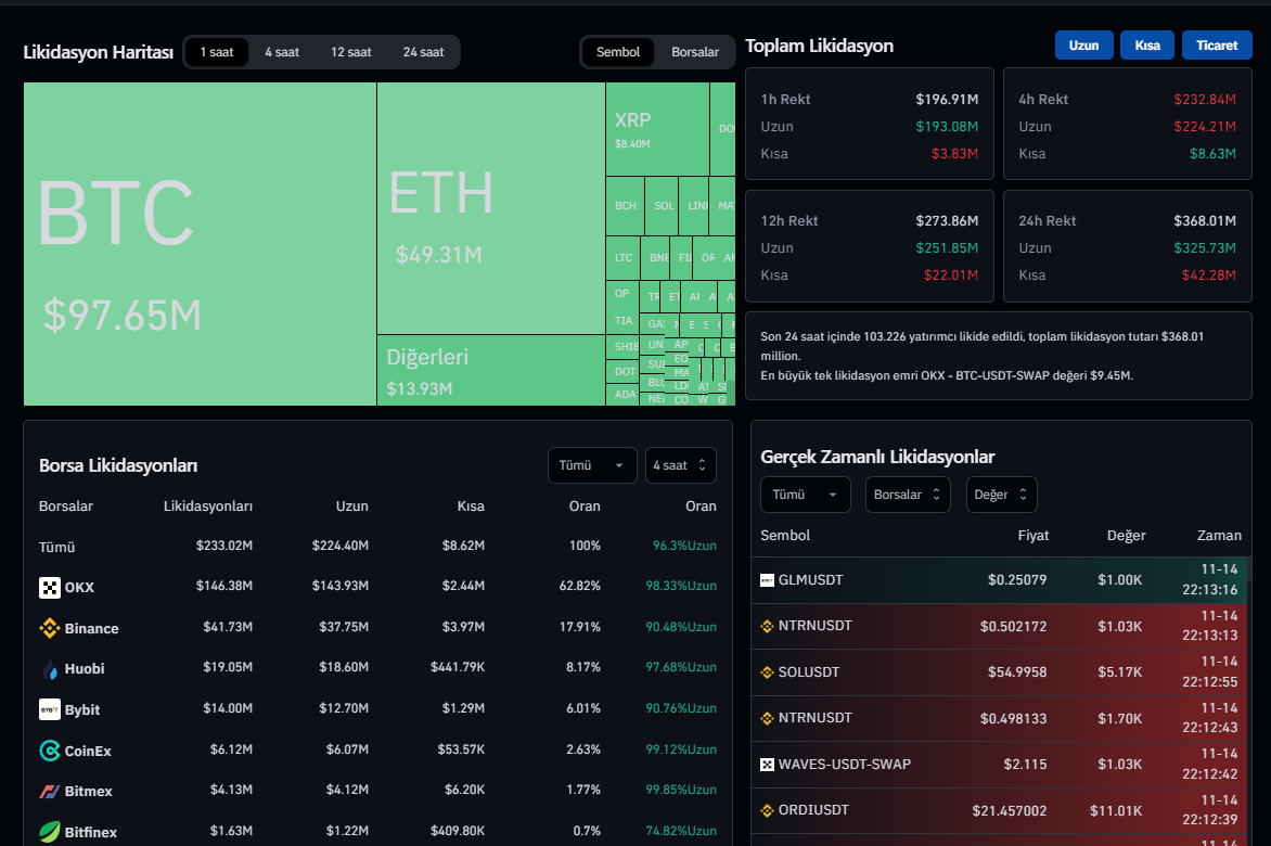 Son 24 saatte ise 368 milyon dolarlık pozisyon likit edilirken, bu pozisyonların 325 milyon dolarlık kısmının ise yine long pozisyonlar olduğu gözlemlendi.