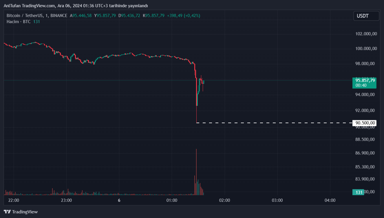 Geçtiğimiz dakikalarda lider kripto para birimi Bitcoin (BTC) üzerindeki satış baskının daha da yoğunlaştığı gözlemlendi. 104 bin dolardan düşüşe geçen BTC, son 10 dakika içerisinde ise 98 bin dolardan bir anda 90.500 dolara kadar bir düşüş yaşadı.