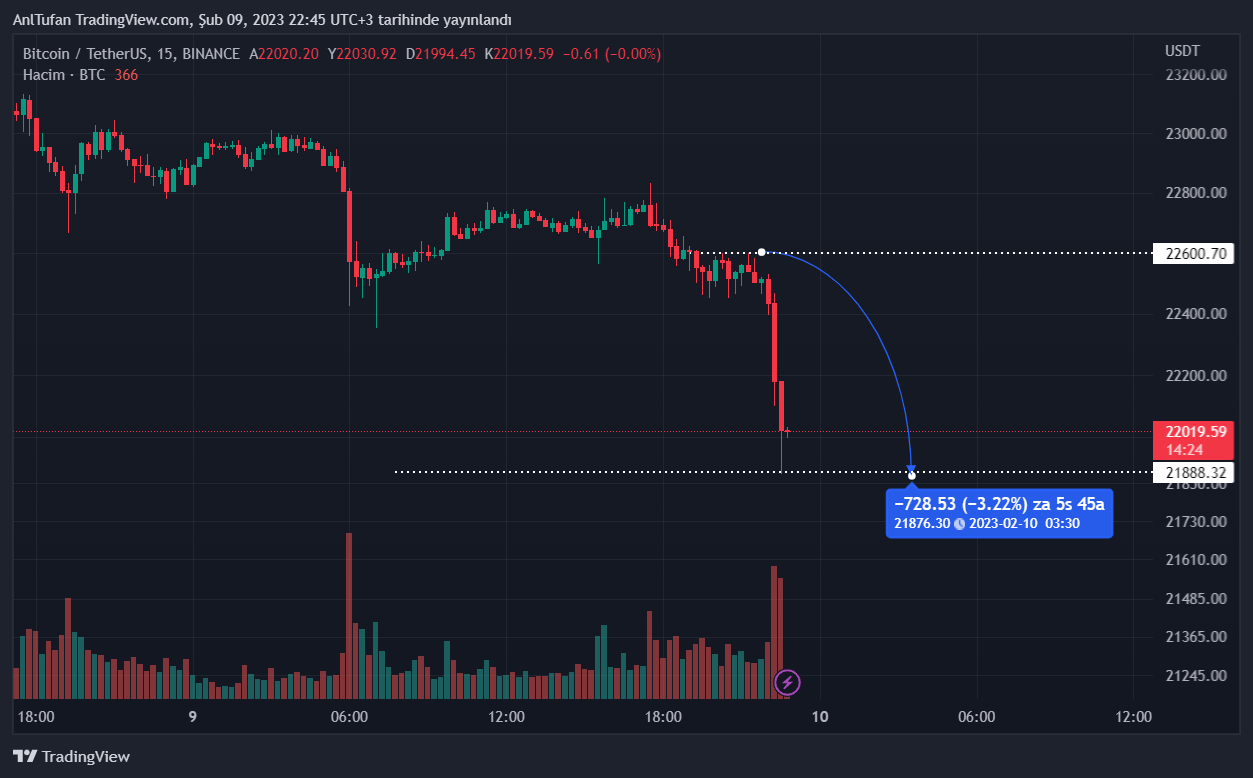 Dakikalar içerisinde yüzde 3’den fazla düşüş yaşayarak 21.888 dolar seviyelerine kadar gerileyen Bitcoin (BTC), önümüzdeki dakikalarda ise 22 bin dolar seviyesinin altında kalması halinde çok daha büyük düşüşler yaşayabilir gibi gözükmekte.