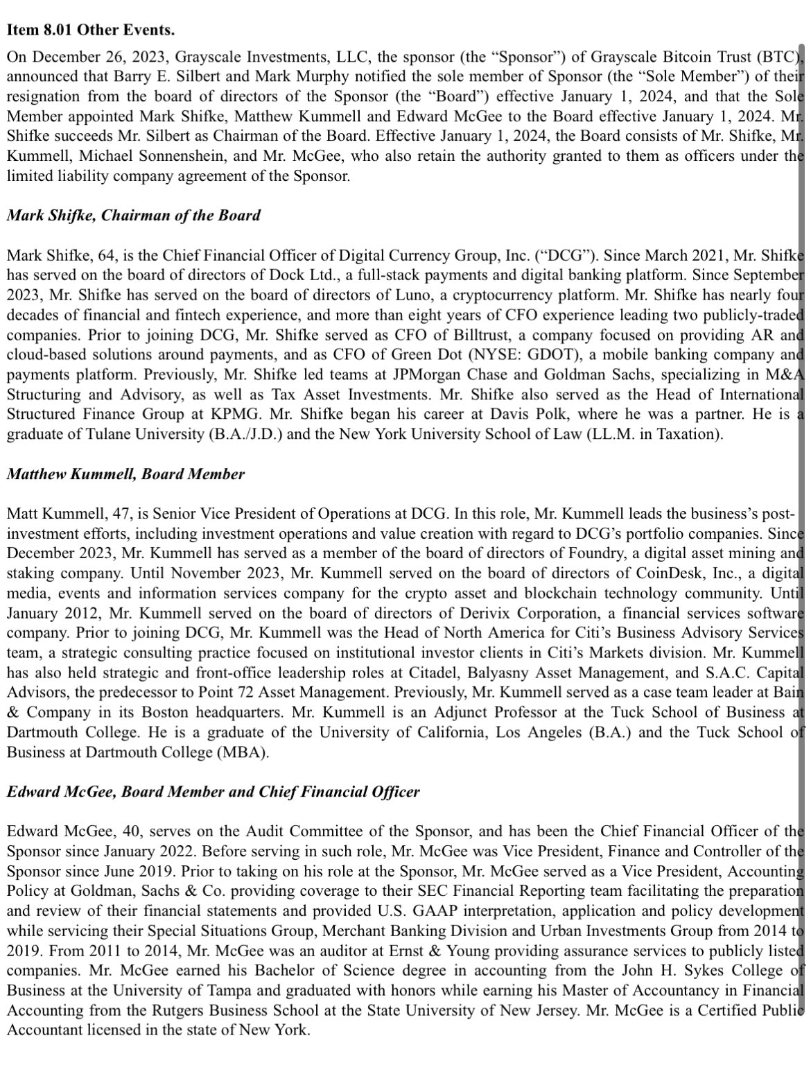 Barry E. Silbert ve Mark Murphy, 1 Ocak 2024 tarihinden itibaren Yönetim Kurulu’ndan istifa edecek ve yerlerine Mark Shifke, Matthew Kummell ve Edward McGee getirilecek.