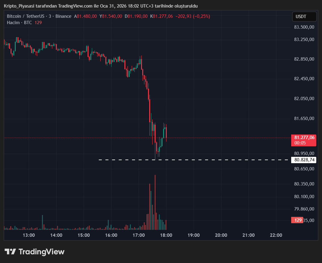 Son dakikalarda Bitcoin yine yoğun bir satış baskısıyla karşı karşıya kaldı. Bir anda 80 bin dolar bandına gerileyen Bitcoin, bugün özelinde -%4’lük bir düşüş yaşamış oldu. Bu düşüş altcoin’lerin de çökmesine yol açtı.