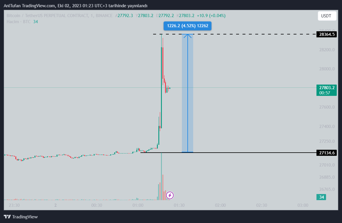Kripto para sektöründe haftalık kapanış artık son 1.30 saat kalmış durumda. Haftalık kapanışlara çok kısa bir süre kala lider kripto para birimi Bitcoin (BTC) ani bir yükseliş gerçekleştirerek 28.350 dolar seviyesine yükseldi.