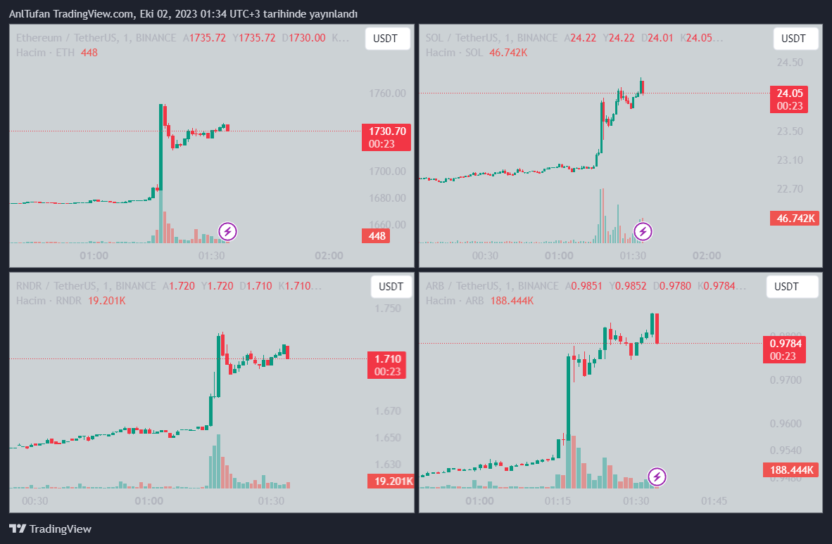 Son dakikalarda Bitcoin’in bu yükselişleri Ethereum’un haricinde, SOL, ARB ve RNDR isimli popüler altcoin’lerin çok ciddi sıçramalar gerçekleştirmesini sağladı.