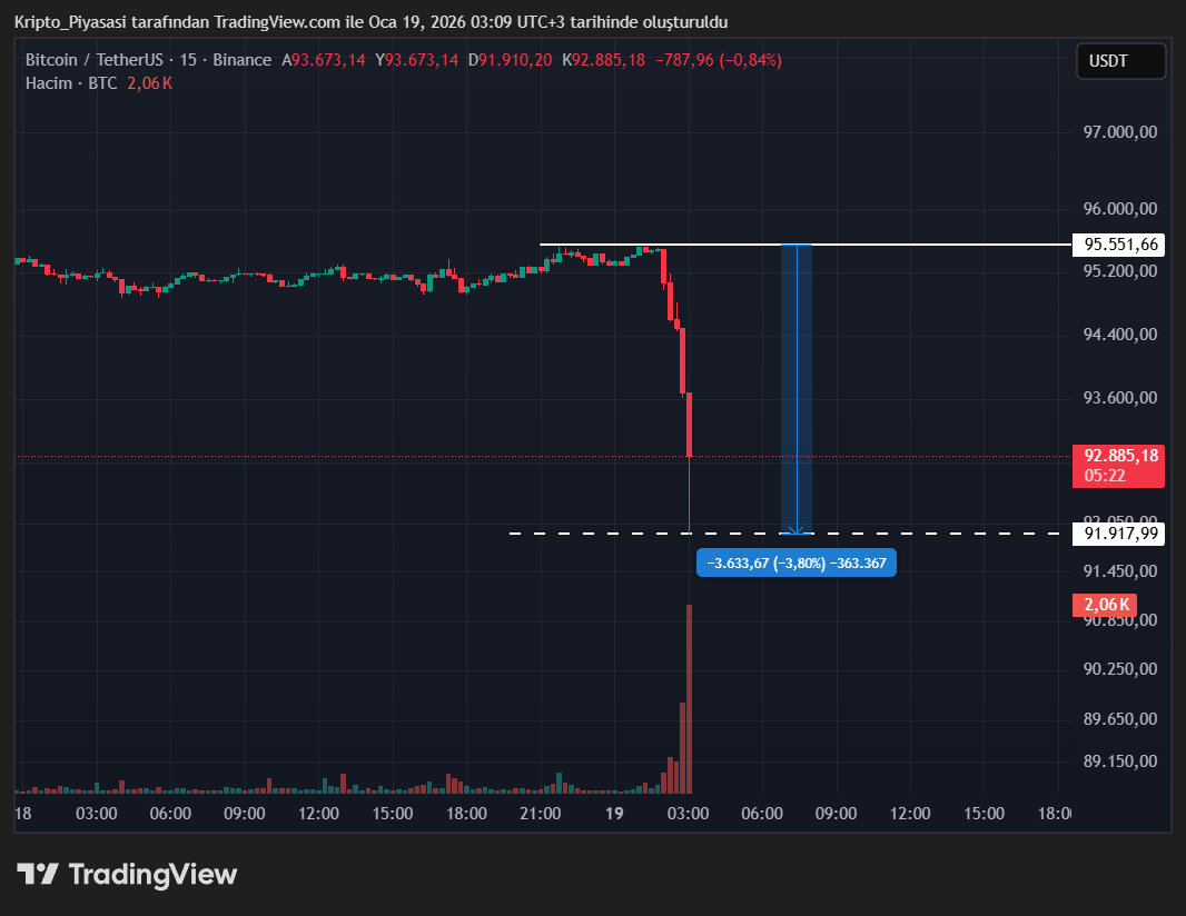 Kripto para sektöründe bir hafta daha geride kalırken, haftalık kapanış önce lider kripto para birimi Bitcoin (BTC) düşüşe geçti. Dakikalar içerisinde 95.550 dolar seviyelerinden 92 bin dolar bandına gerilen BTC, piyasadaki korkunun artmasına neden oldu.