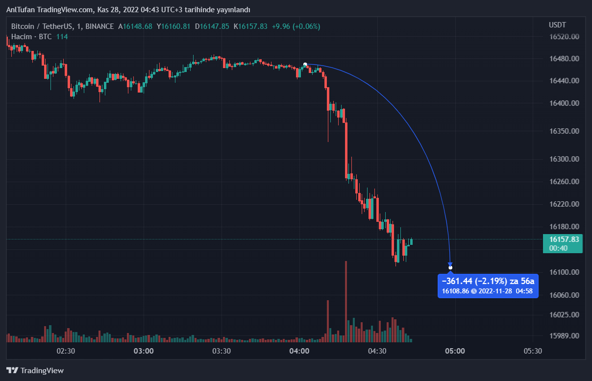 Son dakikalarda yüzde 2’den fazla değer kaybeden Bitcoin, 16.100 dolar seviyelerine kadar gerilemiş durumda.
