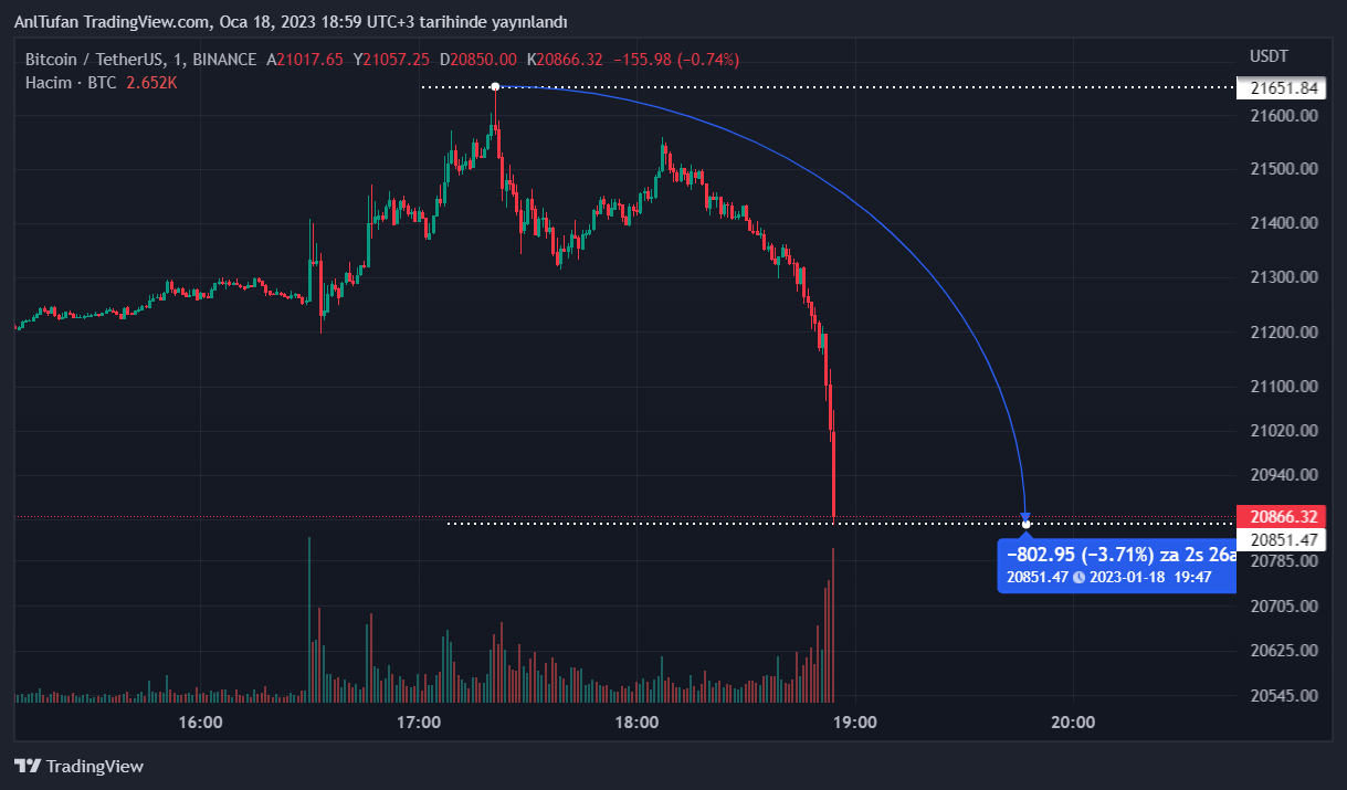 Bitcoin’in son dakikalarda 21.650 dolar seviyesinden 20.850 dolara kadar gerilediği görüldü. BTC’nin 21 bin doları kaybetmesi, ilerleyen saatlerde bu düşüşlerin hızlanmasına neden olabilir.