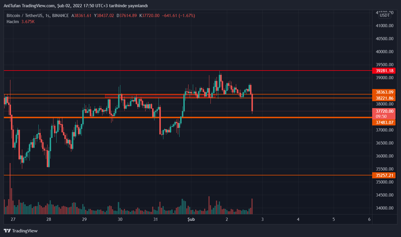 38.200 – 38.350 dolar destek seviyesini an itibariyle kıran Bitcoin altında 4 saatlik kapanış daha yapmamış durumda. Sert satışların geldiği Bitcoin’in şuan için neden böyle bir satış yediği bilinmemekte.