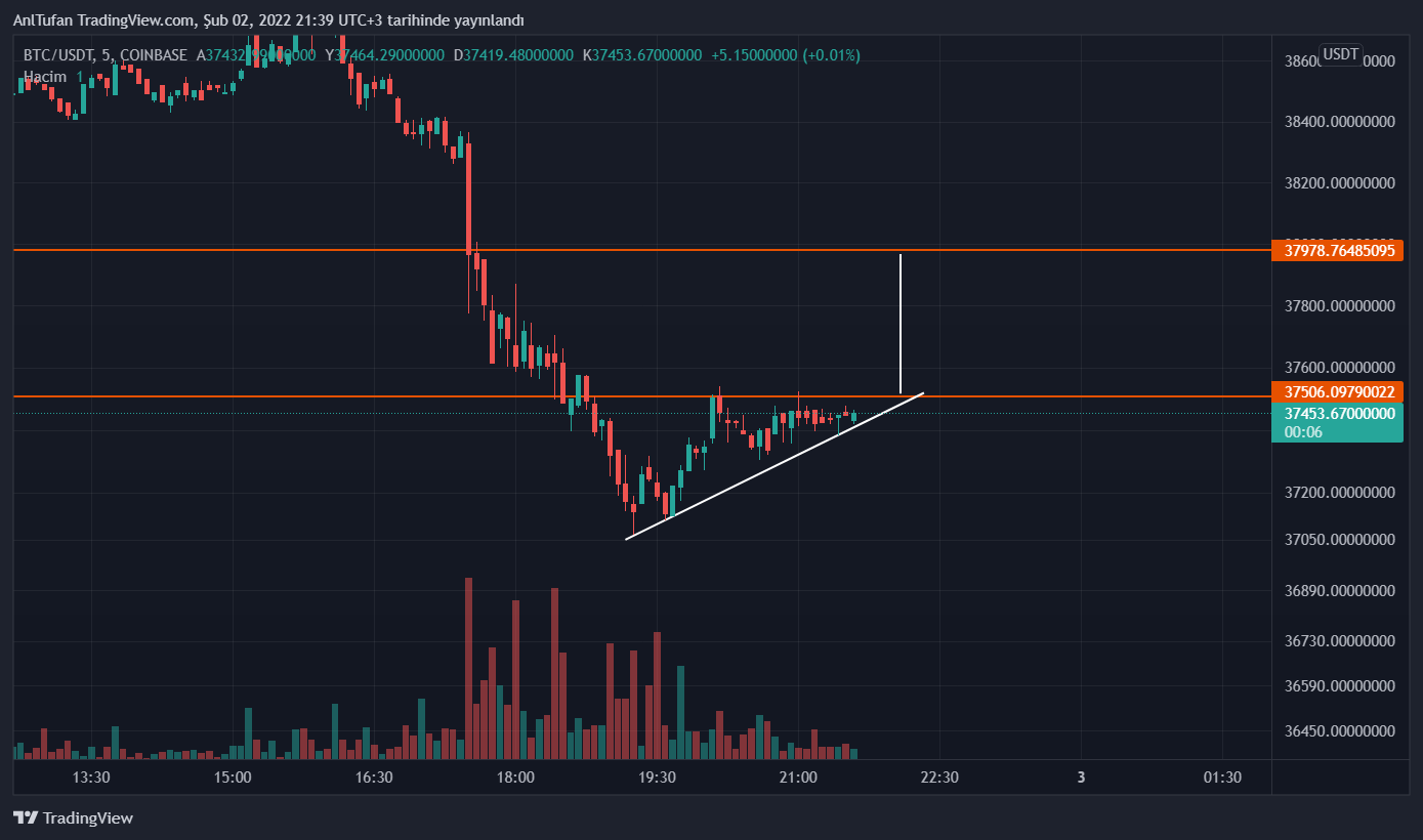 Haberimizi güncellediğimiz sırada 5 dakikalık grafikte bir yükselen üçgen formasyonu oluşturmuş olan Bitcoin, bu formasyonun yukarı kırılmasıyla birlikte 38.000 dolar seviyelerine kadar bir yükseliş yaşanması beklenebilir.