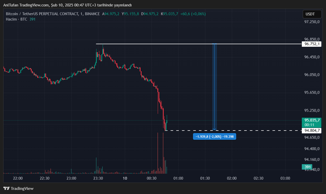Çin’in aldığı bu son karar yine Bitcoin’deki (BTC) satış baskısını artırdı. BTC son dakikalarda 96.750 dolardan 94.800 dolara kadar %2’lik bir düşüş yaşadı. Bitcoin’deki bu düşüş, altcoin’ler üzerindeki satış baskısını da artırdı.