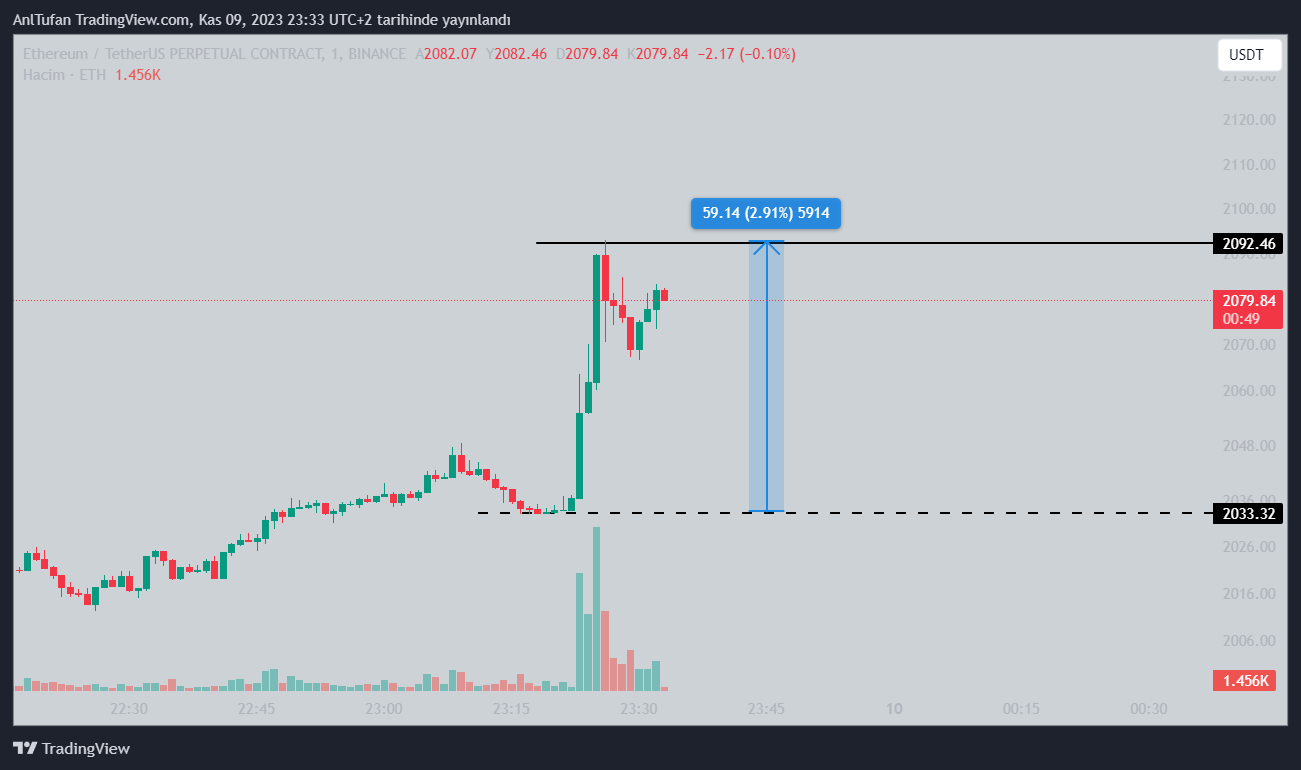 ETF başvurusunun kesinleşmesi sonucunda Ethereum %3’lük bir artış daha yaşayarak 2.092 dolara kadara yükseldi. ETH’nin bugünkü yükselişleri %10’u buldu.