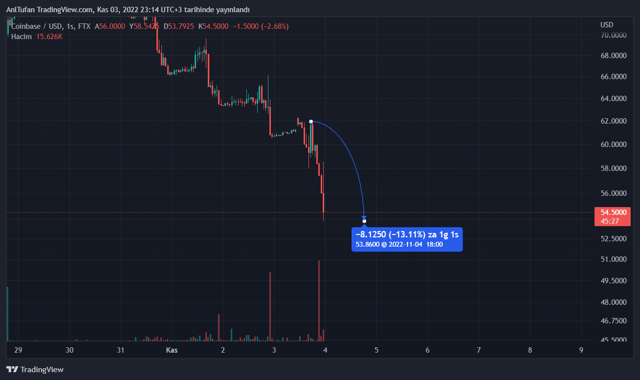 Bugün itibariyle son açıklanan veriler ile birlikte Coinbase (COIN) hisselerinin yüzde 13 oranında düşüş yaşadığı görülüyor.