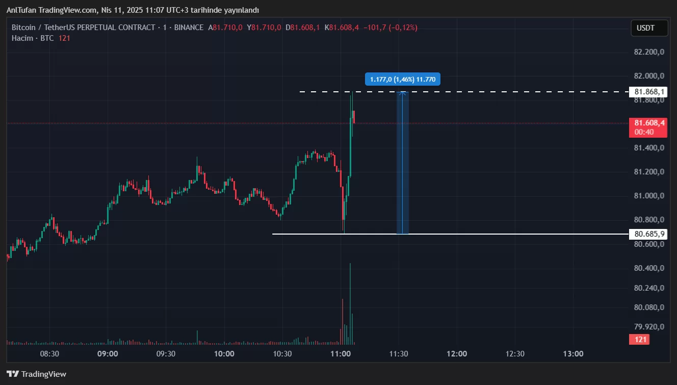 Bitcoin (BTC) bu son dakikalarda gelen haberler karşısında ilk etapta her ne kadar 80.685 dolara kadar geri çekilmiş olsa da, sonrasında ani bir sıçrama ile 81.868 doları gördü.