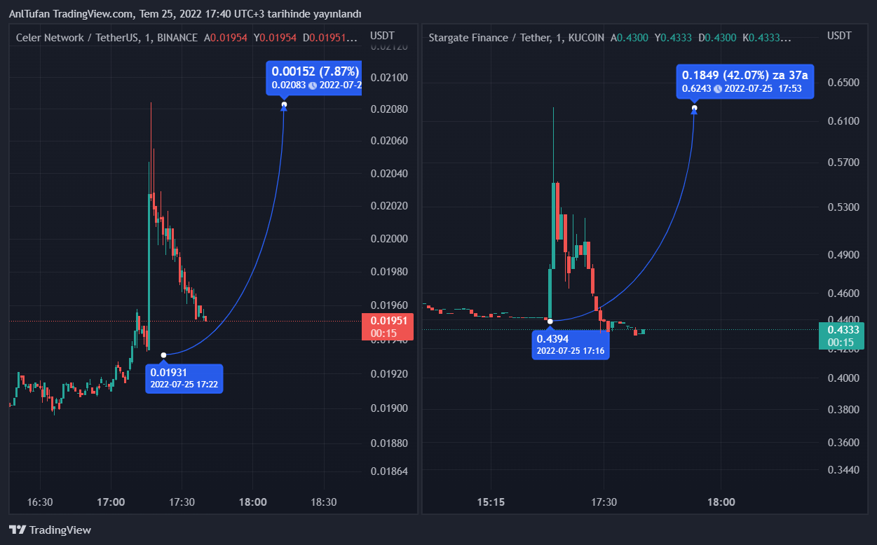 Celer Network her ne kadar bu duyuru sonrası sadece yüzde 7 oranında bir yükseliş yaşamış olsa da, Stargate Finance çok sert bir şekilde değer kazandı.