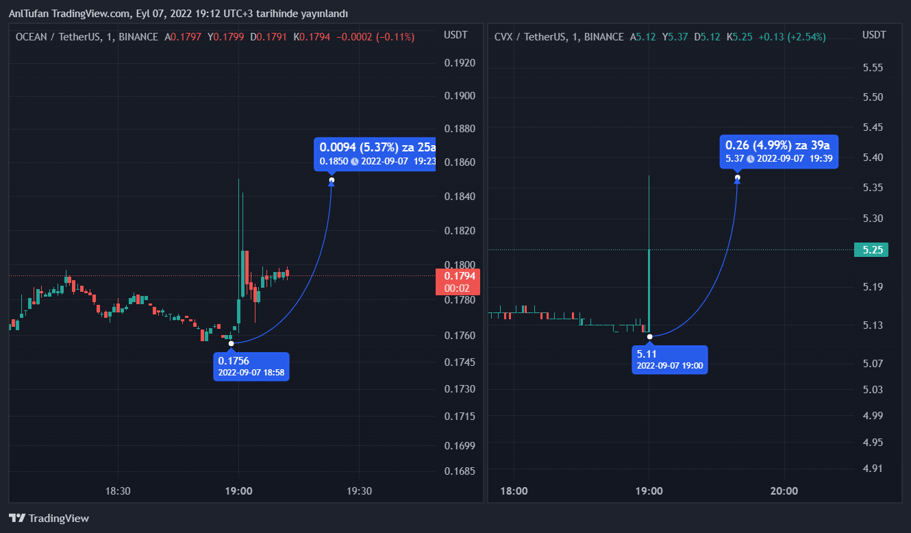 Dün itibariyle popüler borsanın yol haritasına eklemesinin ardından kabaca yüzde 5’lik yükseliş yaşayan bu 2 altcoin, son dakikalar ise tekrardan değer kazanmaya başladığı görülüyor.