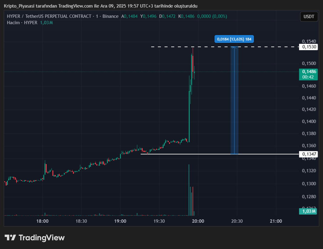 Coinbase’in listeleme duyurusu ile birlikte HYPER fiyatında %15’lik ani bir yükseliş yaşandı. HYPER bir süre daha volatil hareketlerine devam edebilir.