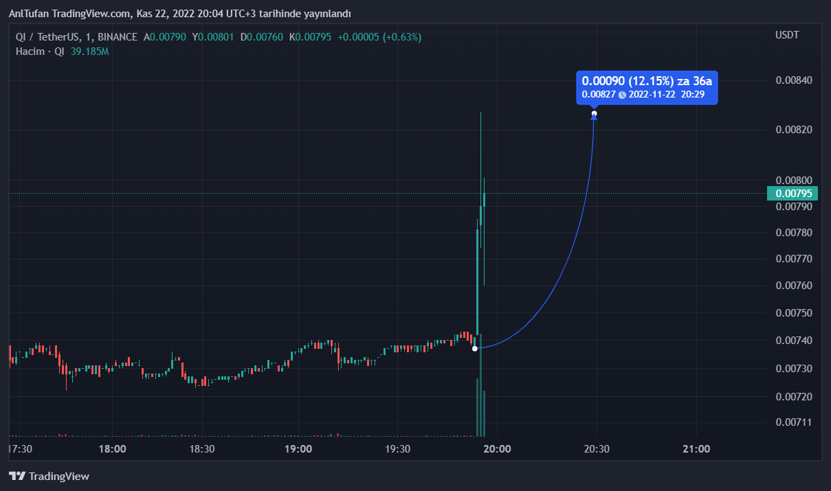 Dakikalar içerisinde yüzde 12’den fazla yükseliş yaşamayı başaran QI, ilerleyen dakikalarda değer kazanmaya devam edebilecek mi? merak konusu..
