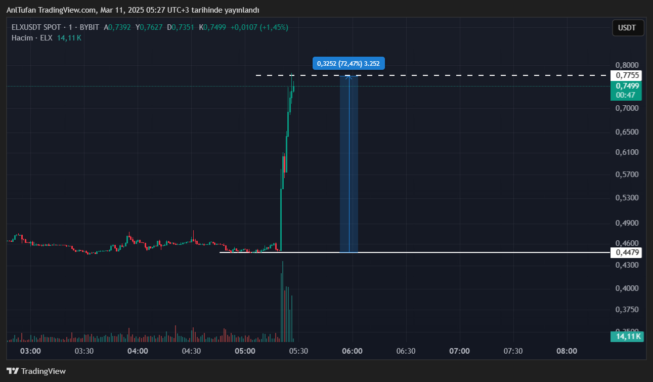 Son gelen duyuru ile birlikte ELX fiyatında ani bir yükselişin meydana geldiği görüldü. Dakikalar içerisinde 0.445 dolardan 0.774 dolara kadar %72 oranında değer kazanan ELX, dikkatleri üzerine çekti.