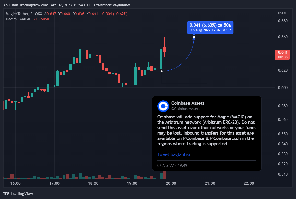 En büyük borsa olarak OKX‘de listeli olan MAGIC, Coinbase’in listeleme duyurusunu paylaşmasının ardından yukarı yönlü hareketler sergilemeye başladı.