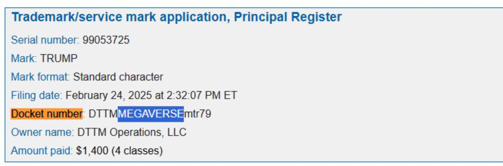 Geçtiğimiz saatlerde ABD Başkanı Donald Trump‘ın şirketi Trump Organization, metaverse ve NFT platformu oluşturmak için bir ticari marka başvurusu yapmıştı. Son dakikalarda ortaya atılan iddialara göre Trump’ın yeni metaverse ve NFT projesinin ismi “Megaverse” olacak.