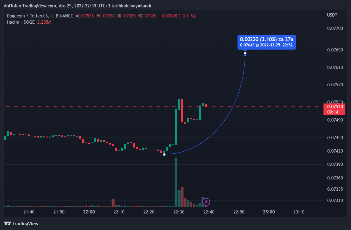 Elon Musk’ın paylaşımının ardından sonra ise Musk’ın yakından desteklediği Dogecoin’in (DOGE) dakikalar içerisinde yükselişe geçtiği görüldü.