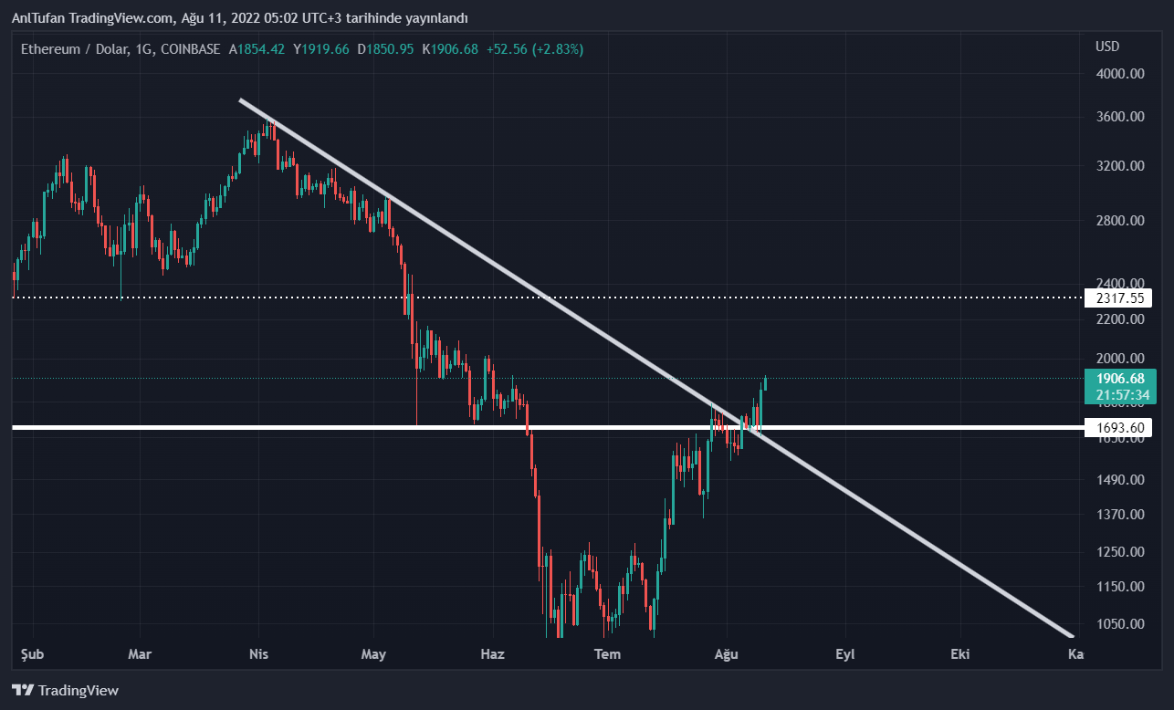 Haberimizin yazıldığı esnada ise Ethereum‘un 1900 doların üzerine çıktığı görülüyor. İlerleyen saatlerde 2300 dolar seviyelerine kadar yükselişine devam etmesi beklenen ETH, kripto para sektörünün yükseliş yaşamasını sağlayabilir.
