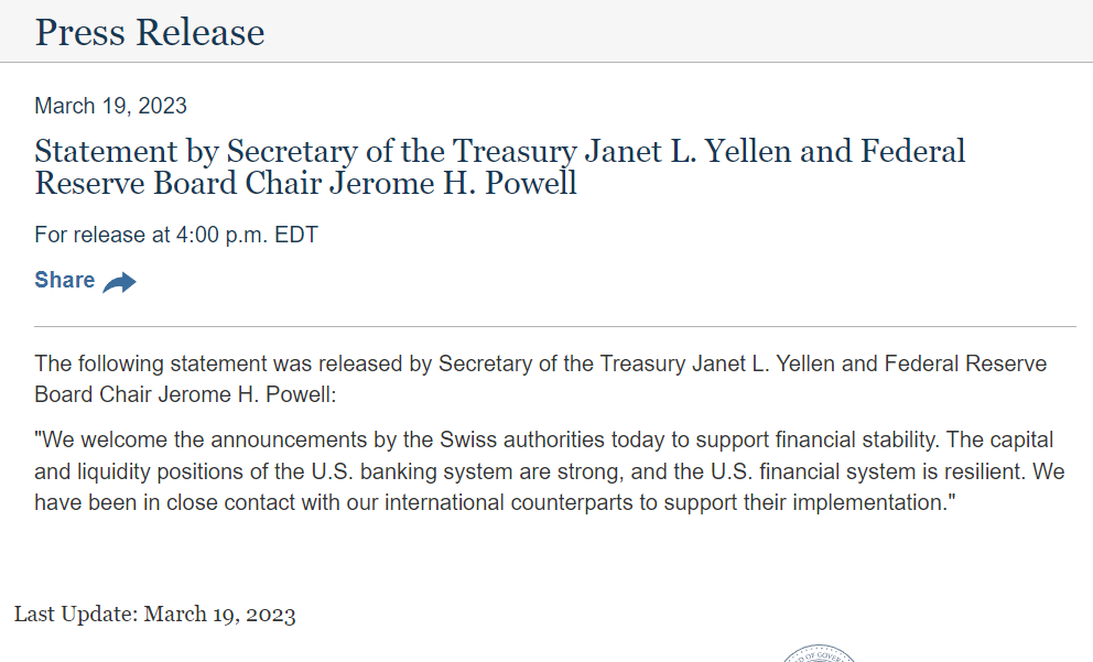 “İsviçre makamlarının bugün finansal istikrarı desteklemek için yaptığı açıklamaları memnuniyetle karşılıyoruz. ABD bankacılık sisteminin sermaye ve likidite pozisyonları güçlü ve ABD mali sistemi dirençli. Uygulamalarını desteklemek için uluslararası muhataplarımızla yakın temas halindeyiz..”